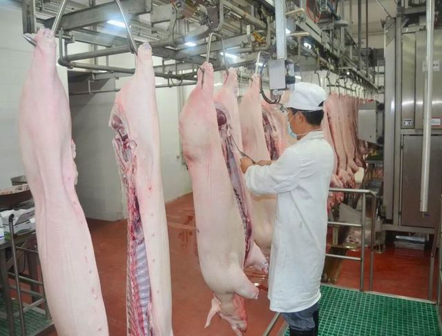 毛豬車(chē)輛入廠時(shí)嚴(yán)格車(chē)輪消毒池和人員專用通道消毒;卸車(chē)后經(jīng)過(guò)清洗、消毒、烘干等環(huán)節(jié)徹底消殺后方可出廠,確保安全;