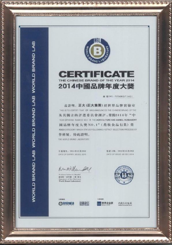 20141229日,總裁世界年會(huì)在北京東方君悅大酒店舉行。本次大會(huì)揭曉了享有中國(guó)品牌奧斯卡之稱(chēng)的世界品牌實(shí)驗(yàn)室2014年中國(guó)品牌年度大獎(jiǎng)評(píng)選結(jié)果,正大集團(tuán)、中國(guó)國(guó)航、國(guó)家電網(wǎng)、騰訊控股、中國(guó)人壽、中國(guó)國(guó)旅、北汽集團(tuán)、華為技術(shù)、長(zhǎng)虹電器等30個(gè)活躍在中國(guó)經(jīng)濟(jì)舞臺(tái)的領(lǐng)軍品牌榮獲中國(guó)品牌年度大獎(jiǎng),正大集團(tuán)以在農(nóng)牧食品業(yè)多年的探索實(shí)踐和管理經(jīng)驗(yàn),以及良好的產(chǎn)品品質(zhì)和品牌知名度,榮獲農(nóng)牧食品行業(yè)中國(guó)品牌年度大獎(jiǎng)***”榮譽(yù)稱(chēng)號(hào)。哈佛商學(xué)院教授約翰?戴騰博士(John Deighton)、耶魯大學(xué)管理學(xué)院教授萊維·多爾博士(Ravi Dhar)分別進(jìn)行頒獎(jiǎng)及致詞。